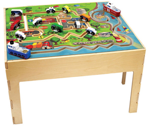Twelve wooden figures include boats, a school bus, ice cream truck, fire engine, ambulance, garbage truck, mail truck, taxi, police car, and city bus. While children guide the cars along the paths and through the roadways to get to their various destinations.